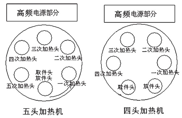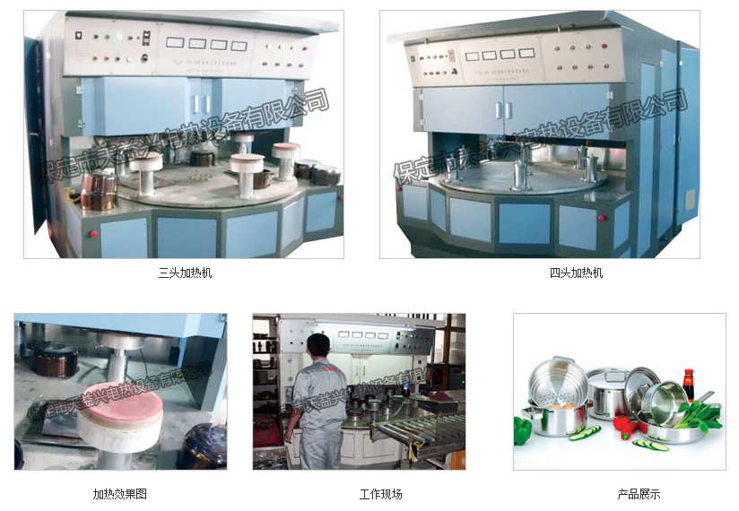 本設備采用旋轉(zhuǎn)式結(jié)構(gòu),鑄鋁轉(zhuǎn)盤上均勻分布6個工件支撐頭,轉(zhuǎn)盤每次轉(zhuǎn)60度角;氣動升降;安裝四個或五個感應頭同時加熱、每個鍋底均經(jīng)四到五次加熱。